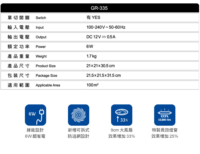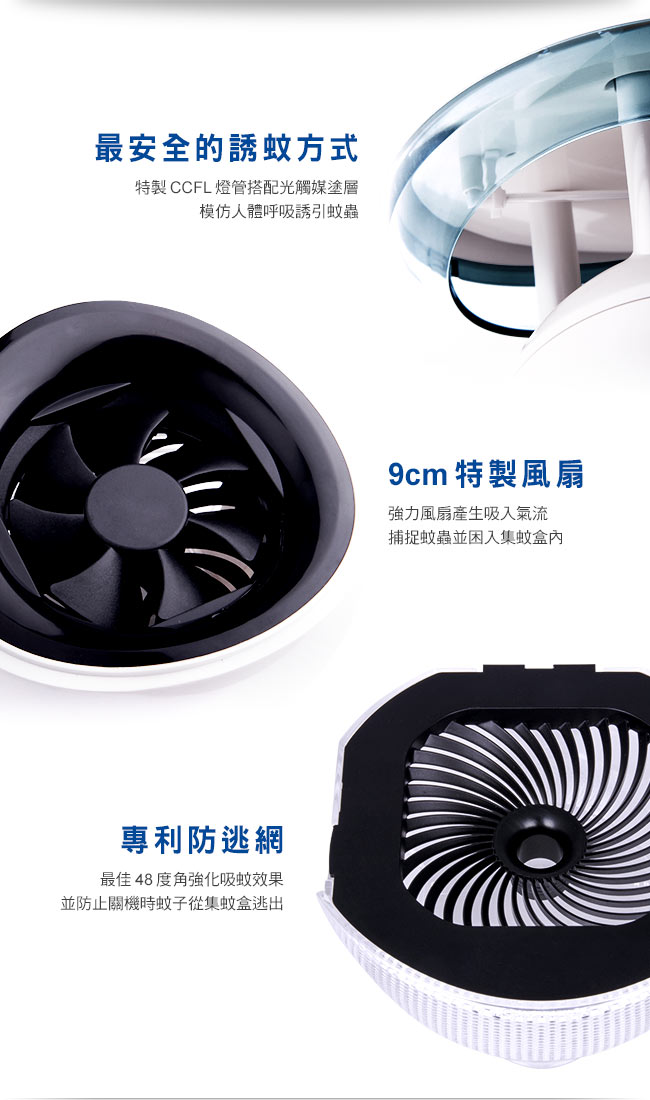 長效燈管,壽命增加65%,超大風扇,風量增加33%以上,全新可拆式旋風式防逃網設計,捕蚊好幫手!