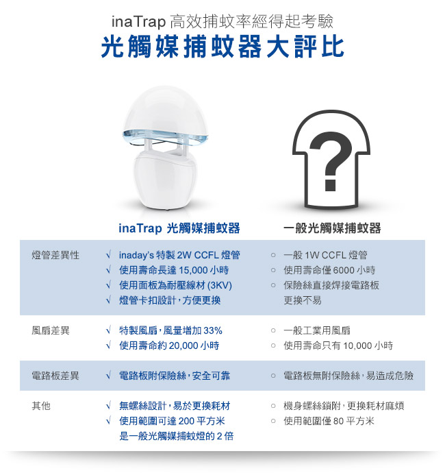 ●誘引方式:紫外線波長、CCFL燈管模擬人體體溫、光觸媒產生二氧化碳